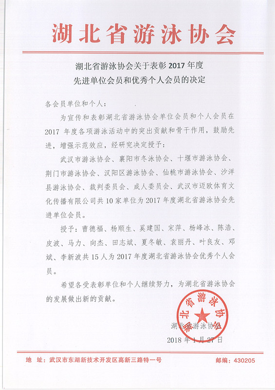 湖北省游泳协会关于表彰2017年度 先进单位会员和优秀个人会员的决定